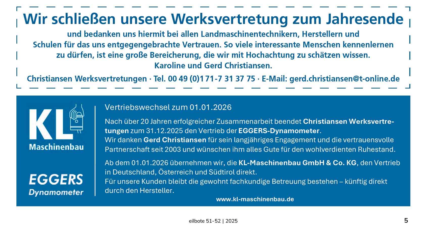 In all den Jahren blieb Gerd Christiansen KL-Maschinenbau als Vertriebspartner erhalten. Für diese langjährige, vertrauensvolle und sehr erfolgreiche Zusammenarbeit, von der der Name Eggers Dynamometer nachhaltig profitieren konnte, bedanken wir uns ausdrücklich.